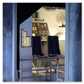 Denne simulator giver dig chancen for at prøve at være en shuttle-kommandør. Følg displayet på skærmen foran dig og brug joysticket til at manøvrere din orbiter. Pas på! Du har kun én chance for at lande, da orbiteren ikke har nogen motorer til at tage dig rundt for et nyt forsøg.