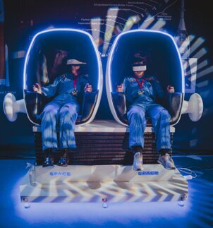 I denne indhyllende stol simulerer denne interaktive oplevelse bevægelserne og luftens forskydning, så besøgende kan opleve en meget realistisk simulation af en gåtur på Mars.